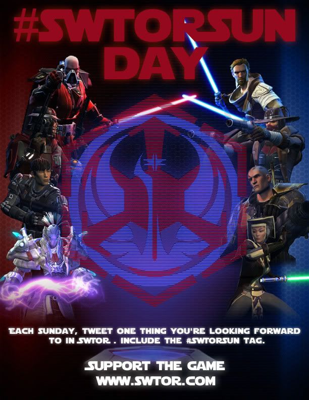 Tweet #SWTORSun on Sunday and include 1. a comment on some feature of the game you are looking forward to and 2. a link back to the SWTOR website. Support the game!